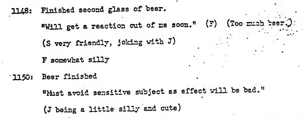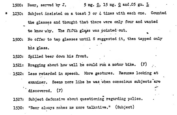 Meanwhile, the presence of this young female assistant was hitting a raw nerve with the group. Wendt constantly deferred decisions to her, and she frequently contradicted him. She joked with the CIA agents and giggled incessantly, all while measuring out the drugs with a knife tip. During the final test, she and Wendt became so drunk on the beer intended for the subjects they could not finish the proceedings.