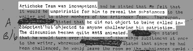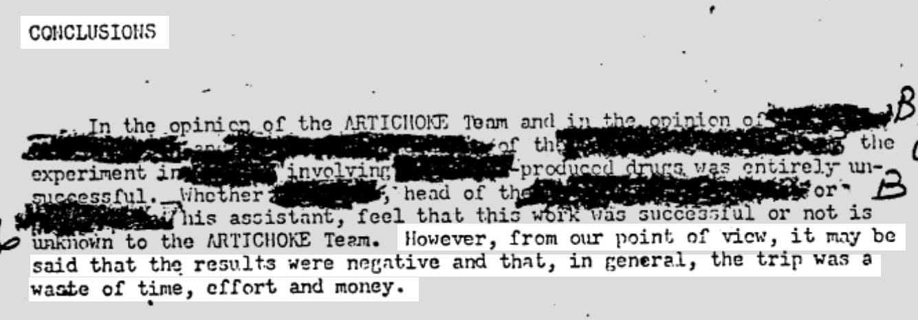 The ARTICHOKE team is also of the opinion that to a great extent a fraud was perpetrated or at least a gross misrepresentation was made to the [redacted] by the [redacted] concerning use [redacted] funds both at [redacted] and in the advocation of this [redacted] expedition. Certainly, results in [redacted] clearly established that [redacted] had either a total lack of understanding and a completely inadequate preparation or had made a deliberate attempt to mislead and deceive.6