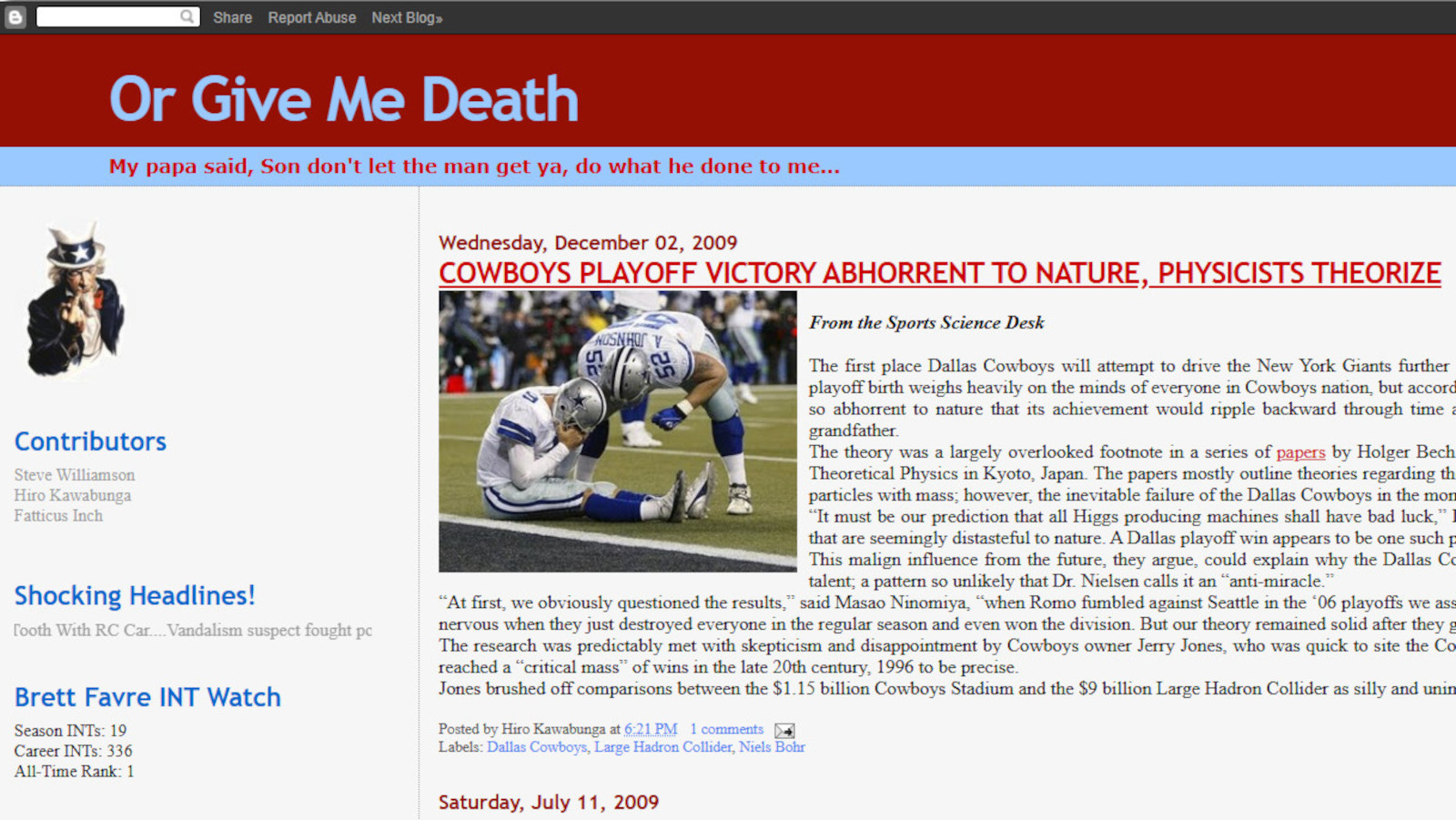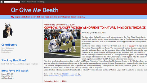 From the primordial swamp of Web 1.0 emerged the unearned era of the blog. Suddenly, anyone could be a publisher. Against this backdrop came the dream of assembling the sharpest, funniest minds of West Texas to produce a journal of culture, sports, and satire. When that dream quickly failed, the OrGiveMeDeath blog was born instead, launched on September 15, 2005. I’ll spare the in-depth history of the site and origin of the name, which was covered here 5 years ago,