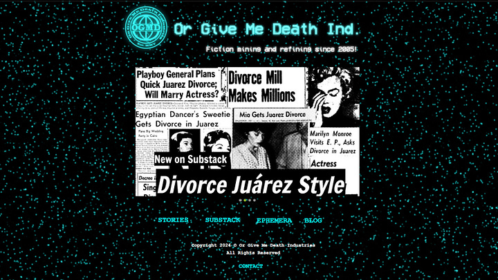 After twenty years, OrGiveMeDeath has come full circle to Substack, the latest iteration of the blog. And the OrGiveMeDeath catalogue continues to grow. I'm excited to announce our next venture into yet another dying medium: the first stage play from OrGiveMeDeath is coming this fall. Stay tuned.